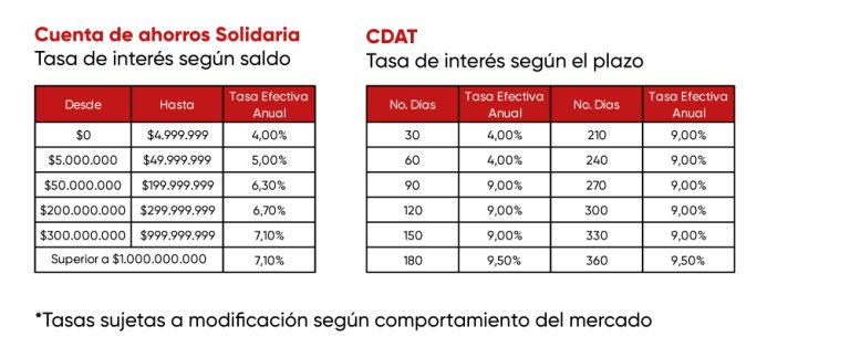 En virtud de lo anterior, señor Asociado, presentamos las siguientes tablas con las tasas de interés de los diferentes productos que ofrecemos: Cuenta de Ahorros Solidaria o CDAT (Certificado de Depósito de Ahorro a Término), para que elija la opción que mejor se ajuste a sus propósitos: