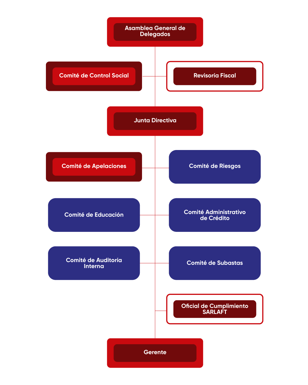 El Comité de Riesgos tiene como función principal servir de apoyo a la Junta Directiva en el establecimiento de políticas de gestión de riesgos, a través de la presentación para su aprobación de las propuestas de límites, metodologías y mecanismos de medición, cobertura, mitigación y gestión de riesgos, así como la presentación de los reportes periódicos sobre la situación particular de cada uno de los riesgos. Estará conformado por dos (2) miembros de la Junta Directiva con sus respectivos suplentes, el Responsable del Área de Gestión de Riesgos, Gerente y Director financiero.